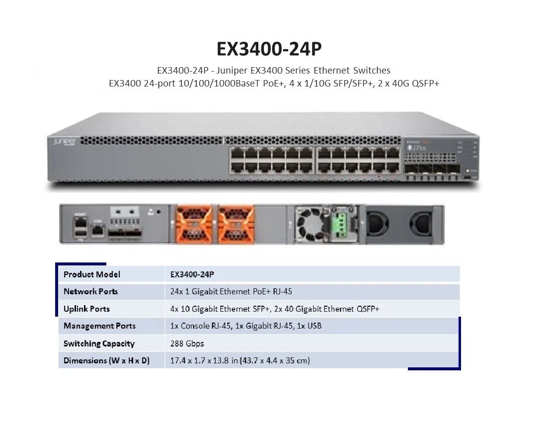EX3400-24P 24-Port Gigabit PoE 4-Port SFP+ 2-Port QSFP+ Switch Single AC Off-Leased 3 months Warranty